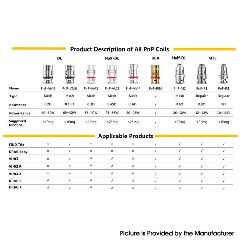 Voopoo PnP series of coils fit several Voopoo kits including the Vinci series, Drag series, Argus series, Navi and Find series. Options include the R1 Ceramic 0.8ohm coil, M2 Mesh 0.6ohm coil, VM1 Mesh 0.3ohm coil and VM3 Mesh 0.45ohm coil.
