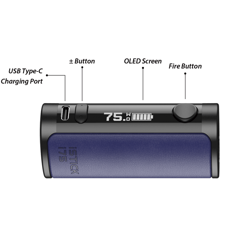 Powered by a built in 3000mAh battery with fast charge 2A USB Type-C cable the iStick i75 will keep you vaping longer and charging less. Available working modes include Voltage (adjustable up to 9v), Wattage (adjustable up to 75w) and Smart Mode which will adjust to the resistance of the coil to prevent burning. The digital display shows the current mode, power level, and remaining battery life (1 - 5 bars). When firing, the display shows the coil resistance, recommended power range and times the length of the draw.