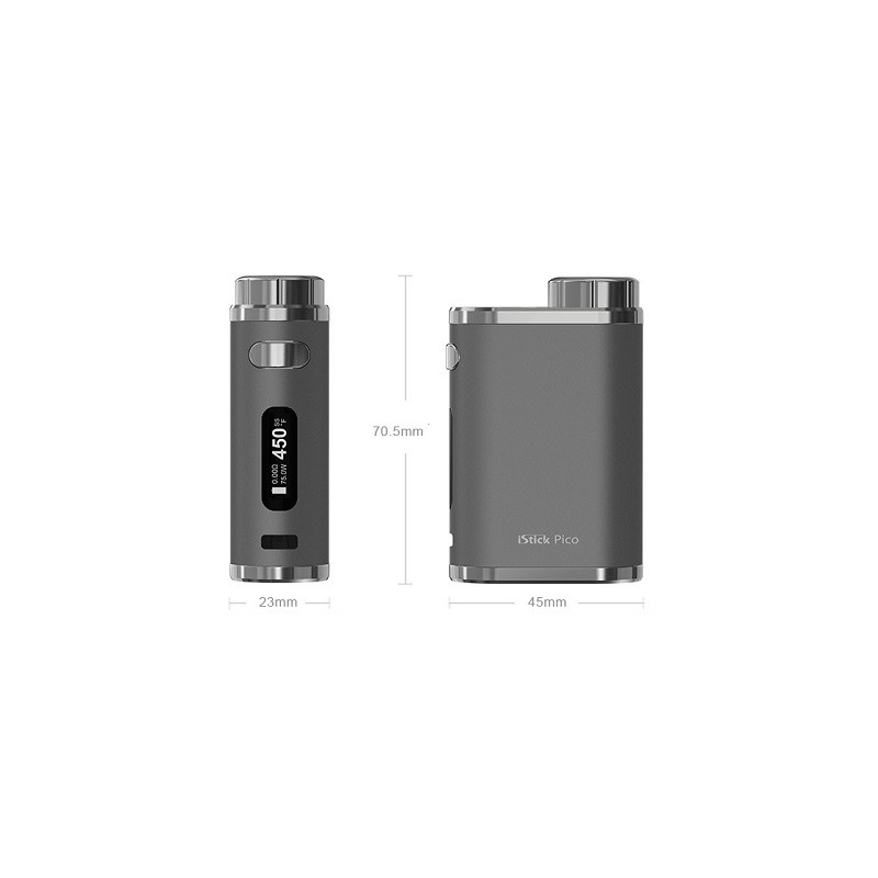 Eleaf iStick Pico 75w temp control external 18650 device. Supports several temperature control options, up to 75 watts of power and replaceable 18650 batteries (not included) all in a very portable frame. Fires down to 0.1 ohms. USB Type-C charging.