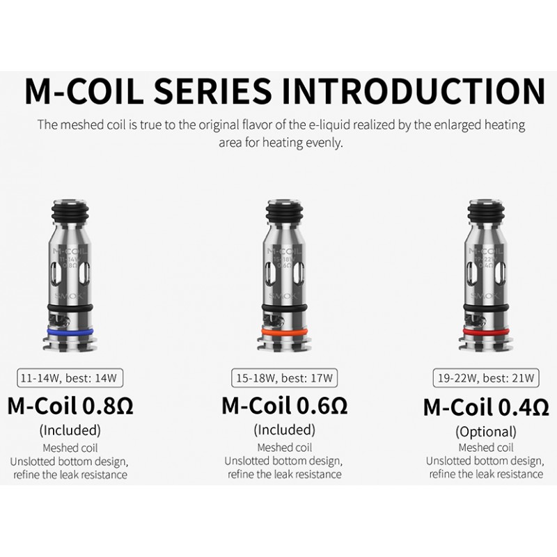 The kit includes a 4ml pod which can easily be filled using the top fill port. There is also a top adjustable airflow control to help you dial in your preferred draw. The coils can easily be changed due to their push and pull design. Simply pull one coil out and push another one in. The kit uses the SMOK M-Coil series which are available in different resistances. There are 2 different coils included in the kit, one is installed and the other is a spare.