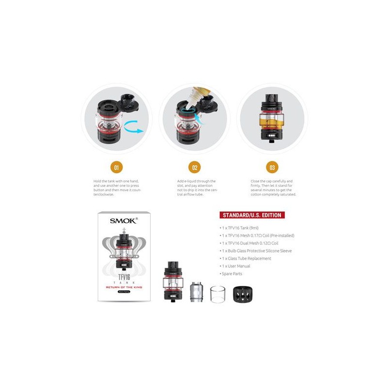 Included in the box is 1 TFV16 Mesh 0.16ohm coil and 1 TFV16 Dual Mesh 0.12ohm coil. Conical Mesh coils are also available. Box also includes a spare glass, spare gaskets, glass protective silicon sleeve and a user manual.