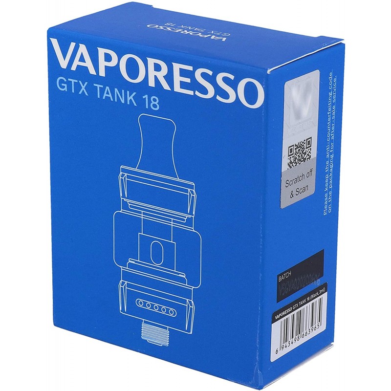 Vaporesso GTX 18 Tank 3.0ml. 2 pull and push coils are included for easy replacement - 0.8ohm Mesh and 1.2ohm Mesh. The top screws off for easy filling. Airflow adjust ring. A spare 2ml glass is included.
