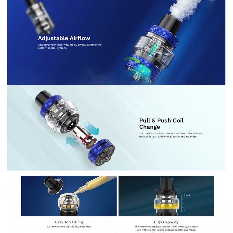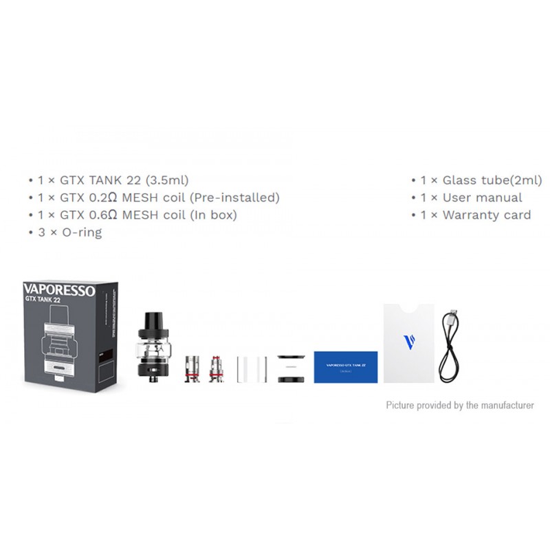 The GTX Tank 22 CRC (child lock version) by Vaporesso is a 3.5ml sub ohm tank compatible with the Vaporesso GTX seris coils. The box includes a 0.2ohm Mesh and 0.6ohm Mesh coil. The coils are pull and push for easy replacement and the top fill gives ample room for adding your favorite liquid. The tank is fitted with a 3.5ml bubble glass and also includes a spare 2ml straight glass. The standard 510 connector allows for maximum compatibility.